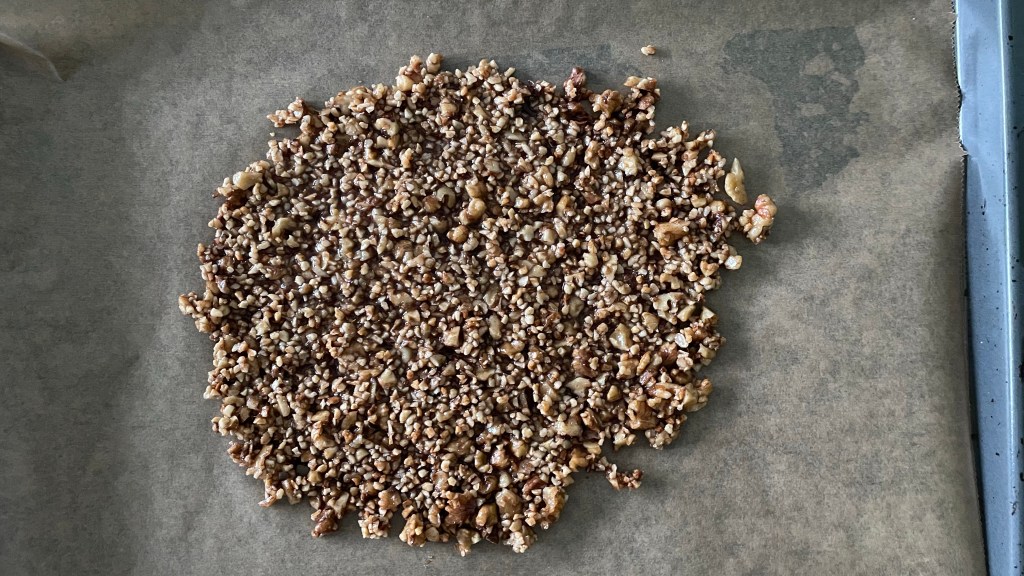 Die Nussmasse auf ein mit Backpapier ausgelegtes Backbleck gießen, glattstreichen und auskühlen lassen. Danach mit einem Messer in kleine Stücke hacken.