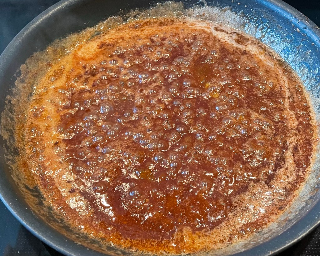 In einer Pfanne den restlichen braunen Zucker, den Zimt und die Aprikosenmarmelade mit der Butter schmelzen, verrühren und etwa 3 Minuten köcheln lassen.