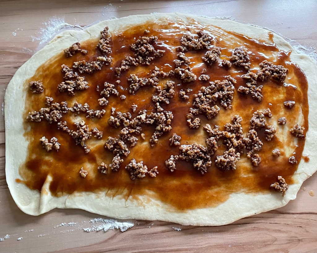 Den Teig zu einem 1 cm dicken Rechteck ausrollen und mit der noch warmen Butter-Marmeladen-Mischung bestreichen anschließend die gehackten Nüsse darüber streuen.