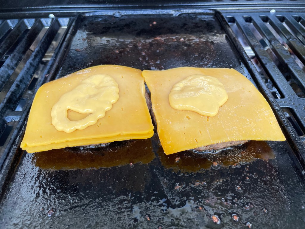 Jetzt die Patties mit reichlich Cheddarkäse belegen und zusätzlich einen ordentlichen Klecks Chili-Cheese Sauce darauf geben. Den Deckel vom Grill schließen und die Patties überbacken, bis der Käse angeschmolzen ist.