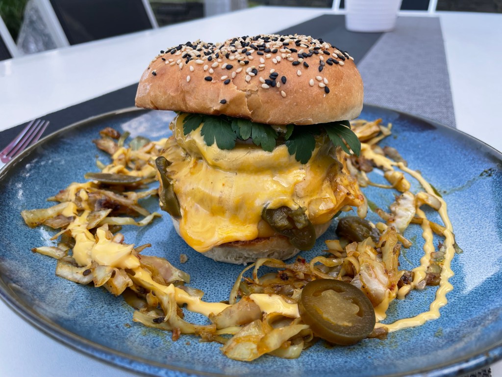 Sind alle Zutaten fertig kann mit dem Zusammenbau begonnen werden. Für die Frische ein paar Gurkenscheiben dann etwas von dem Sombrero-Kraut, die beiden Patties und ein paar Jalapenosscheiben auf die Unterseite des Buns drapieren und mit dem Bun-Oberteil das Meisterwerk abschließen.