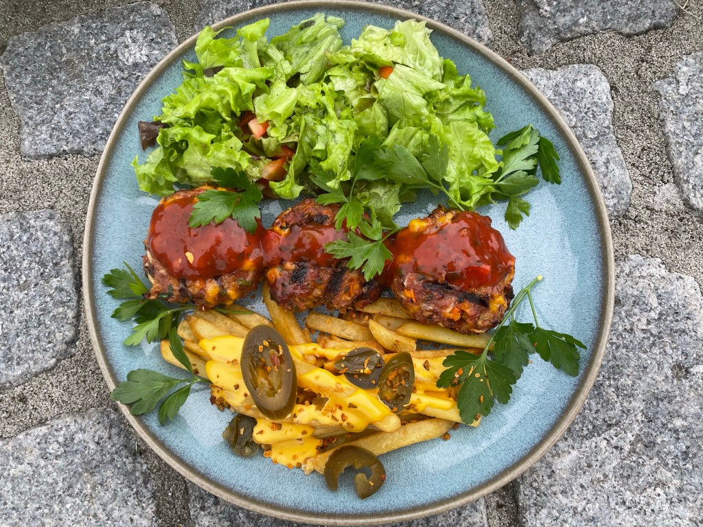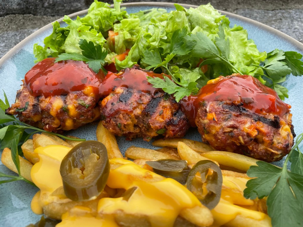 Tex-Mex Cheese-Meatballs habe ich diese heißen scharfen Teile getauft. Mit einer fruchtig scharfen Salsa, Jalapenôs und ein paar Pommes Frites serviert, lassen die Meatballs deine Geschschmacksknospen auf der Zunge Lambada tanzen. Also, Hombres und Chicas, ran an den Grill! Viva los Frikadellos!