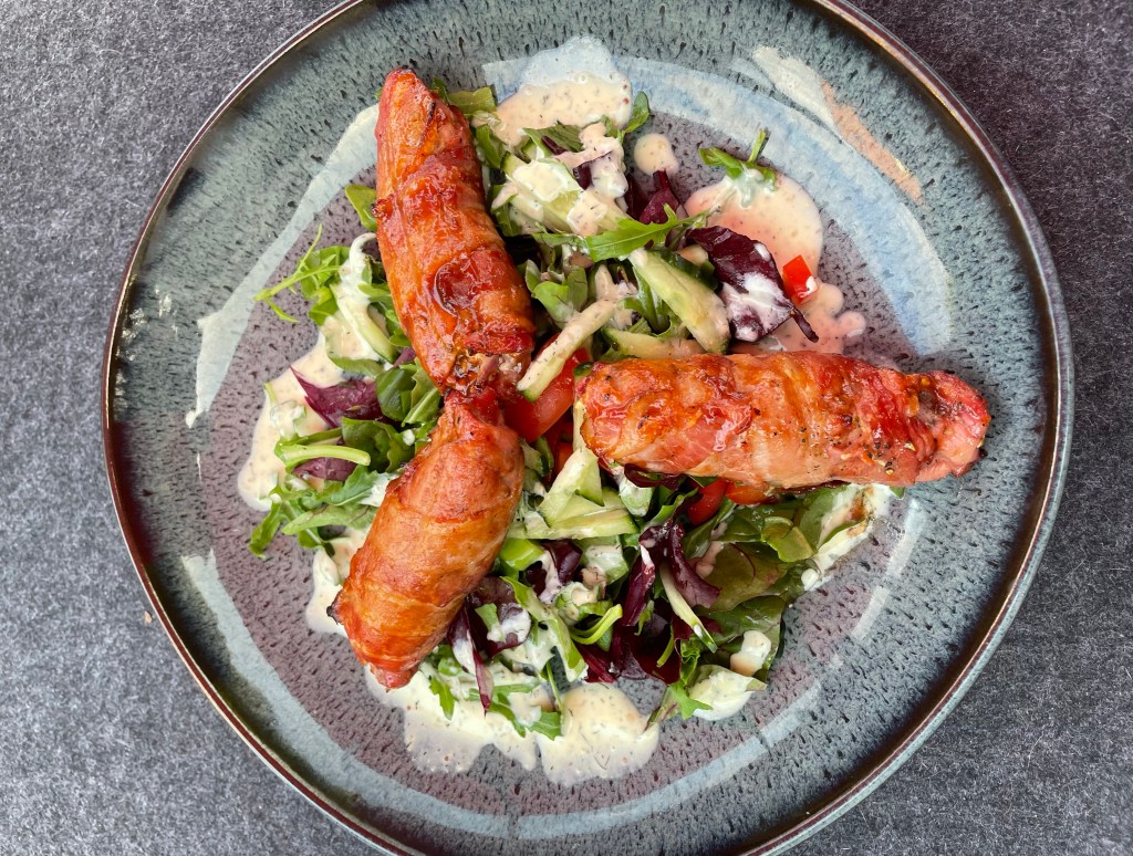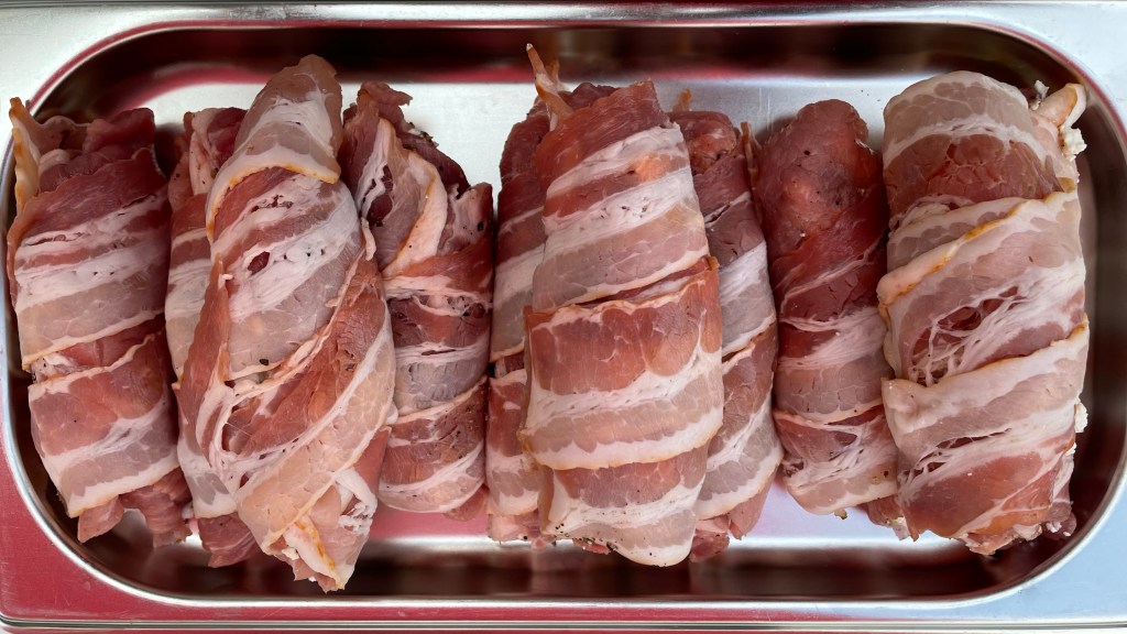 Weiter geht es mit dem Fleisch. Als Grundlage für die Rollen benötigt ihr dünne Scheiben vom Schweinenacken, 5 mm Stärke ist hierfür ideal. Fragt den Metzger eures Vertrauens, er wird euch gerne schöne Scheiben mit der Maschine runterschneiden. Optional kann man auch ein Stück Scheinenacken etwas anfrieren. So lassen sich mit einem scharfen Messer ebenfalls problemlos dünne Scheiben runterschneiden. Die Scheiben mit einem Koteletthammer oder Plattierer noch etwas flacher klopfen und mit dem Rub würzen. Jetzt 1-2 El von der Käsecreme auf das Fleisch setzen und der Länge nach aufrollen. Die Rollen nun noch mit je 2 Scheiben Bacon einwickeln. So, das war es ach schon mit den Vorbereitungen.