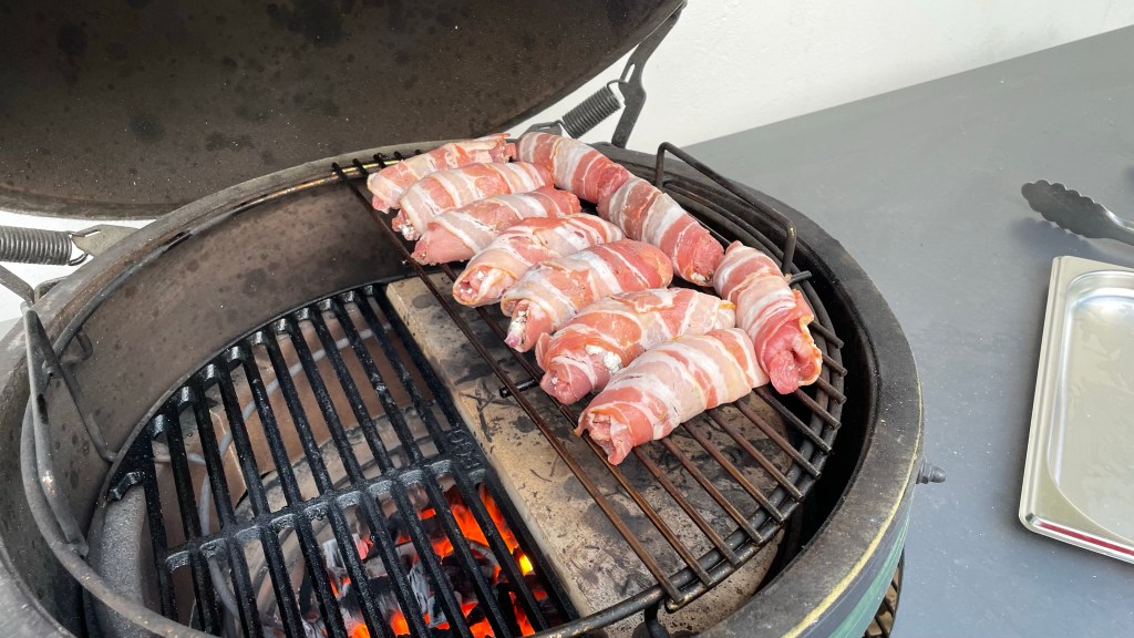 Ist der Grill auf 170 Grad indirekte Hitze eingeregelt, werden die Rollen auf dem Rost platziert und ca. 30-40 Minuten indirekt gegrillt. Nach Ablauf der Zeit die Rollen mit BBQ-Sauce einpinseln und weitere 25 Minuten grillen.