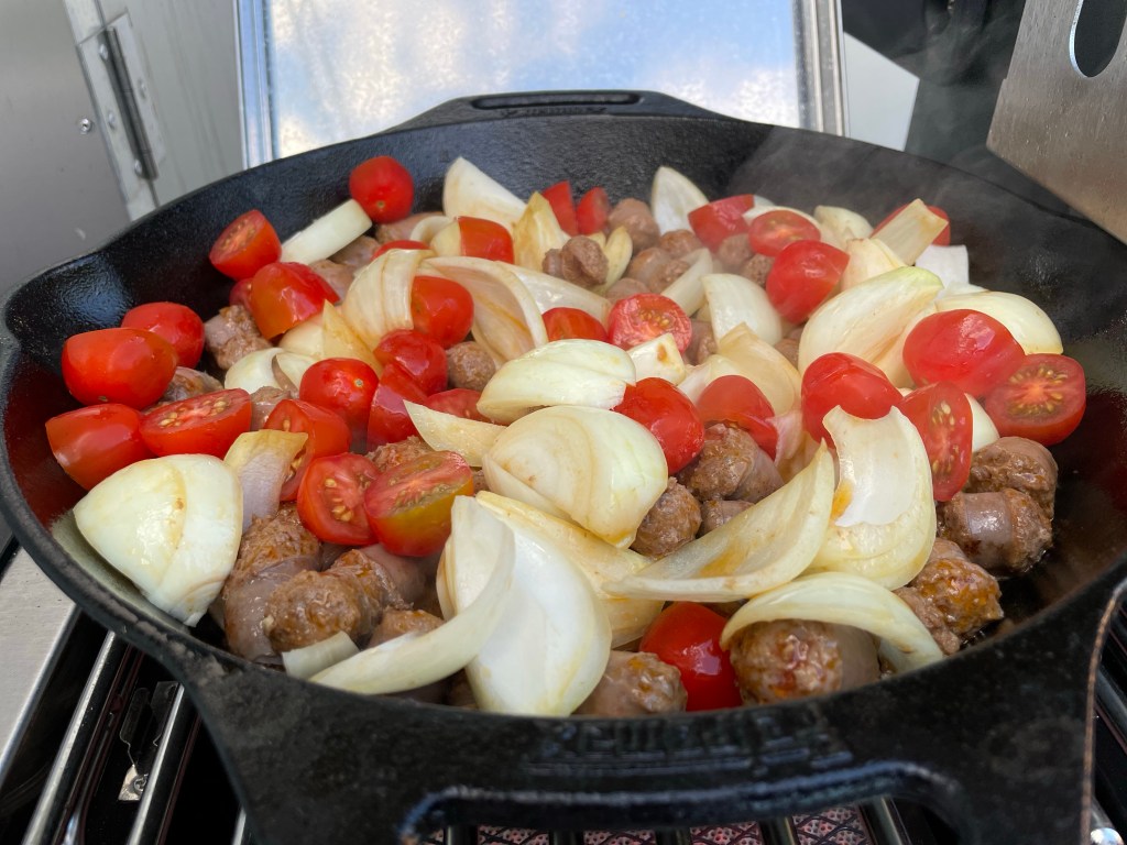 Die geschälten und in Streifen geschnittenen Zwiebeln sowie die halbierten Tomaten hinzugeben und mit anbraten.