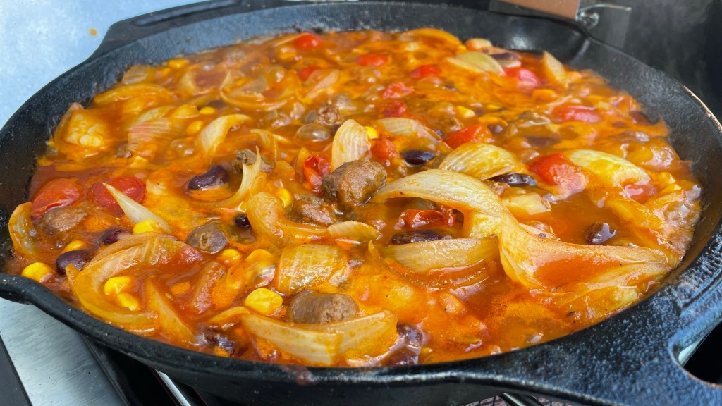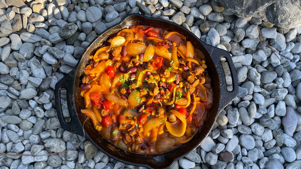 Bohnen und Mais hinzufügen und ca. 20 Minuten bei geringer Hitze etwas einkochen.
