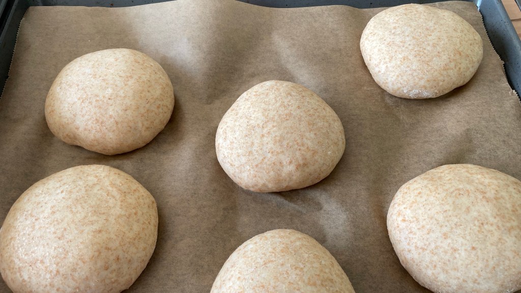 Nach dem erneuten Gehen, kommen die Buns auf ein mit Backpapier ausgelegtes Blech. Achtung, es sollte genug Platz zwischen den Buns gelassen werden, da diese stark aufgehen. Ich empfehle nicht mehr als 6 Buns pro Blech.