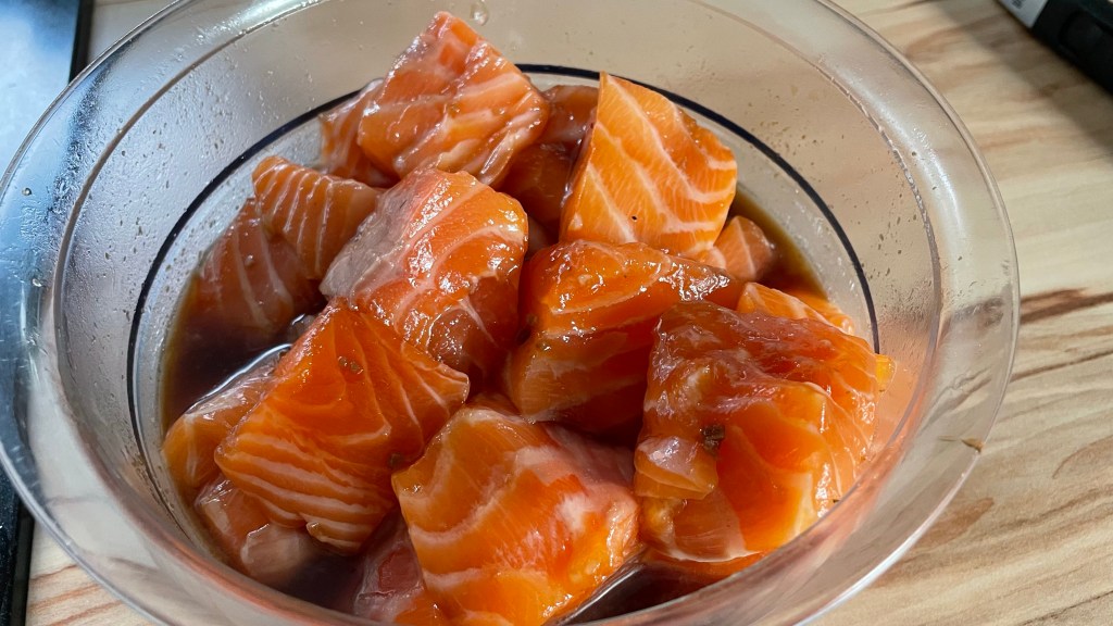 Aus der Lumi Lumi Sauce und dem Ahornsirup eine Marinade anrühren, die Lachswürfel darin wälzen und 2 Stunden im Kühlschrank marinieren lassen.