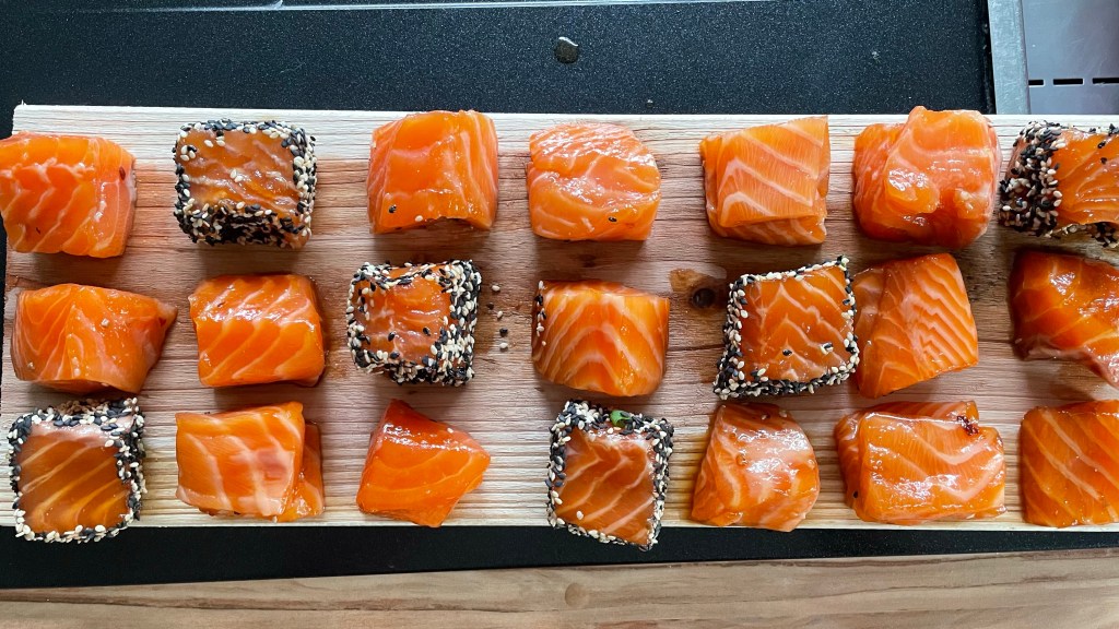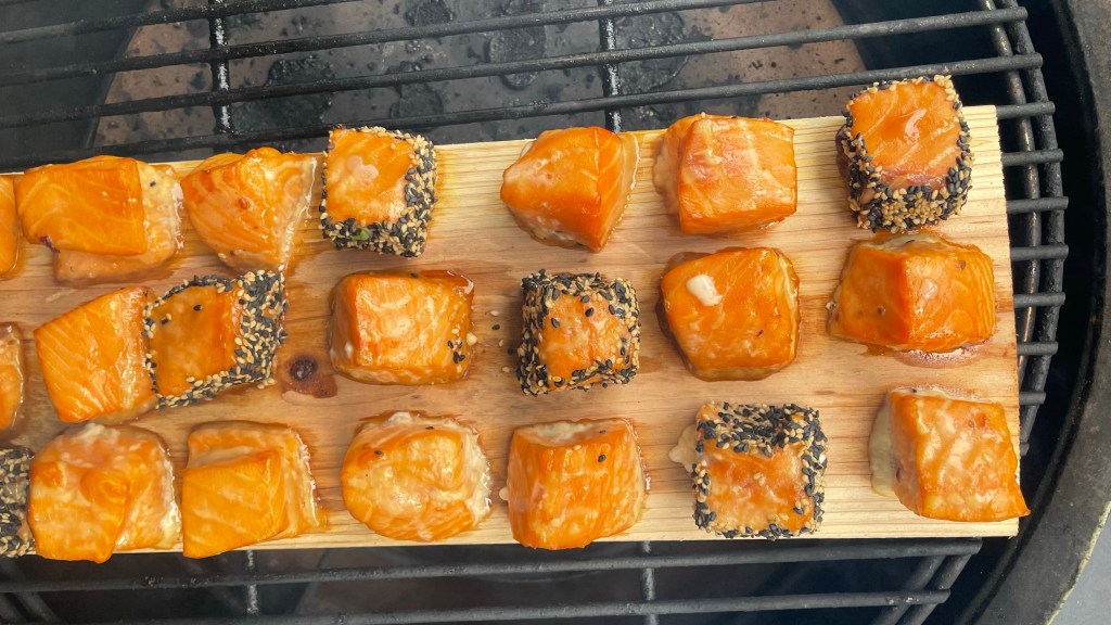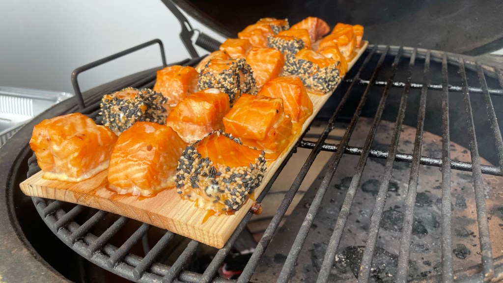 Die Grillplanke aus Holz 30 Minuten in ausreichend Wasser einweichen. Die Holzkohle im Big Green Egg anzünden und mit eingesetztem Rost auf 170 ºC erhitzen. Das Grillbrett trocken tupfen und die Lachswürfel darauf platzieren. Einige der Würfel nach Belieben in dem Sesam wälzen.