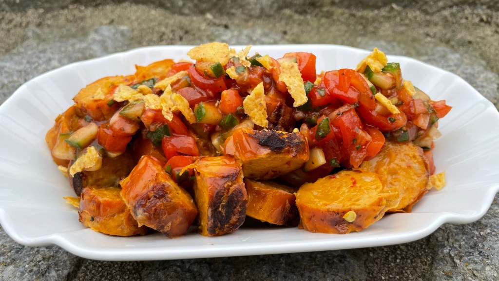 Kleingeschnitten in einer Schale, etwas Salsa darüber geben und mit zerstoßenen Tacochips als Topping servieren. So zaubert man so im Handumdrehen ein richtig cooles Streetfoodgericht, bei dem die Geschmackskospen Autoscooter fahren. Vielleicht ja auch etwas für eure nächste Gartenparty.