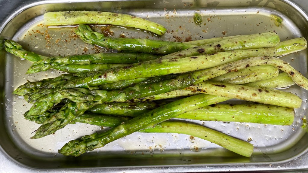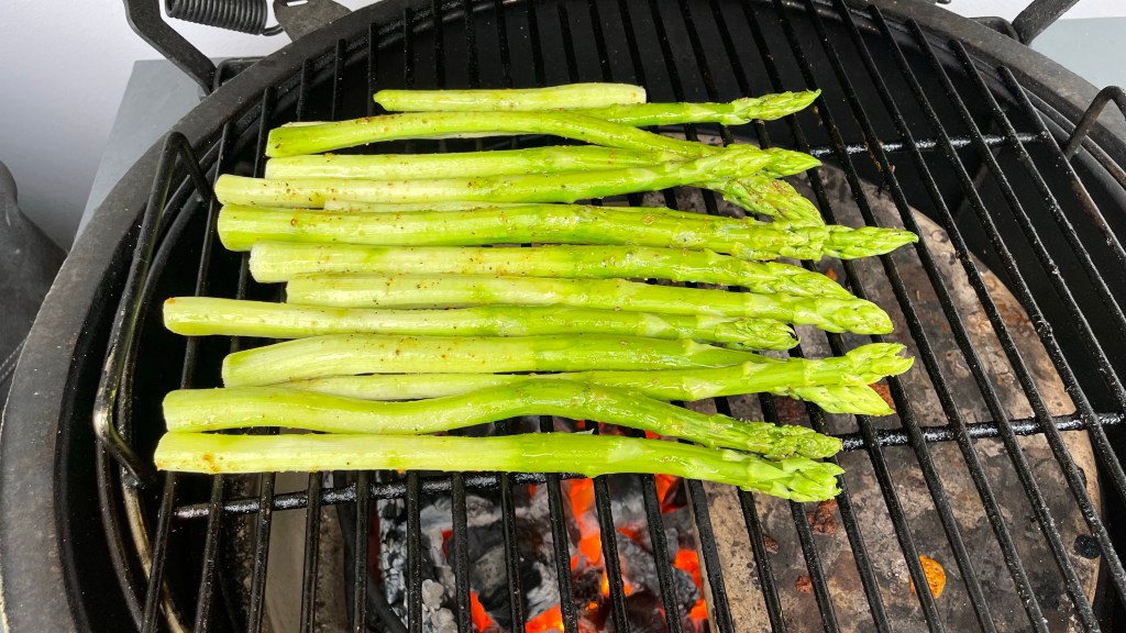 Bei grünem Spargel reicht es aus, nur das untere Drittel zu schälen und die holzigen Enden abzuschneiden. Das grüne Stangengemüse schmeckt gebraten, im Ofen gegart oder gekocht. Ich liebe ihn aber gegrillt. Dieses geht relativ schnell und die Röstaromen geben dem Spargel den letzten Kick. Dazu habe ich die Spargelstangen mit Olivenöl und etwas Rub (Don Marcos Happy Ending) mariniert.