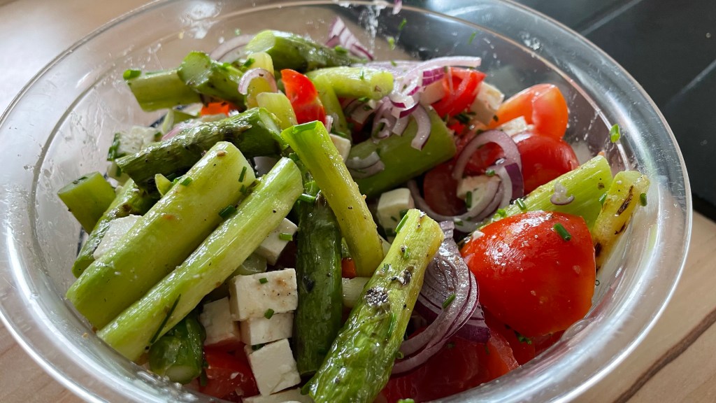 Nach dem Abkühlen wurde der Spargel in mundgerechte Stücke geschnitten und die Kirschtomaten halbiert. Die Zwiebel habe in feine Ringe geschnitten, den Feta gewürfelt und den Schnittlauch noch in feine Rollen geschnitten. Anschließend wurde etwas Sesam hinzufügt und alles in einer Schale gut durchmengt.