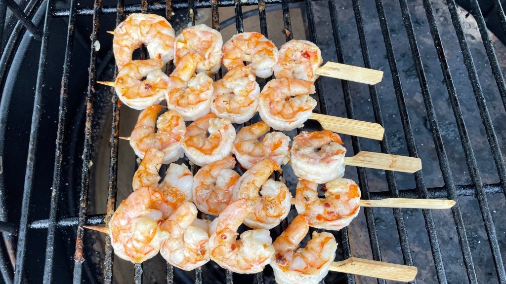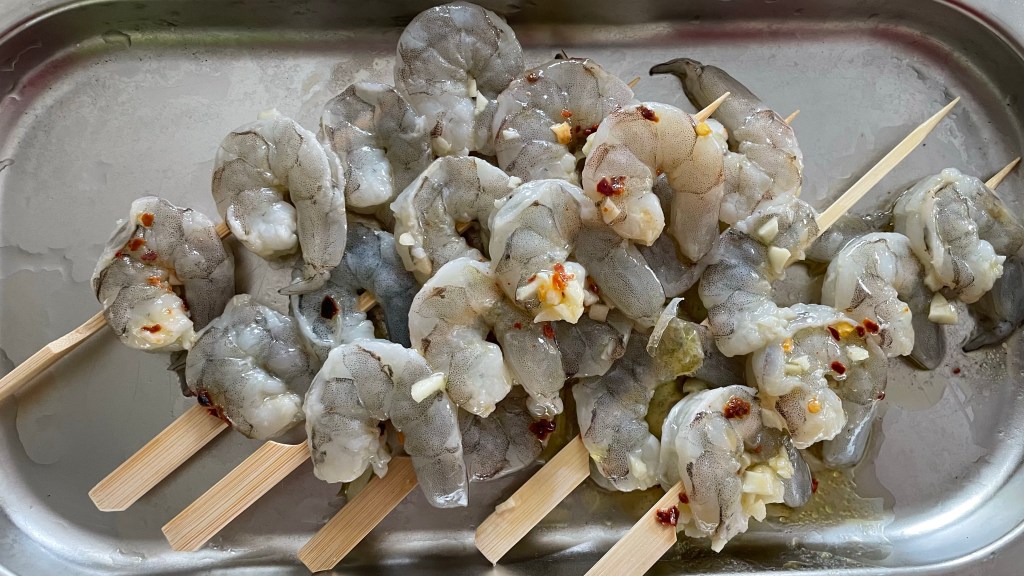 Die aufgetauchten und geschälten Garnelen habe ich gut abtropfen lassen und mit etwas Olivenöl, einer fein gehackten Knoblauchzehe, einer Priese Chiliflocken, sowie etwas Zitronensaft vermengt. Die Garnelen wurden so eine Stunde ziehen gelassen und anschließend auf Spieße gesteckt.