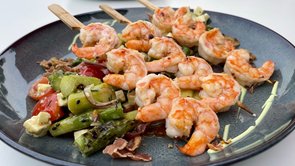 Dieser leckere Spargelsalat mit gegrilltem grünen Spargel darf in der Spargelzeit auf keinen Fall fehlen. Der einfache und schnelle Salat wird mit Tomaten, Zwiebeln und Feta zubereitet. Er ist der perfekte Begleiter zum Grillen und schmeckt ebenfalls super als leichtes Abendessen. Ich habe ihn heute mit leckeren gegrillten Knoblauch-Chili-Garnelen und etwas Aioli serviert.