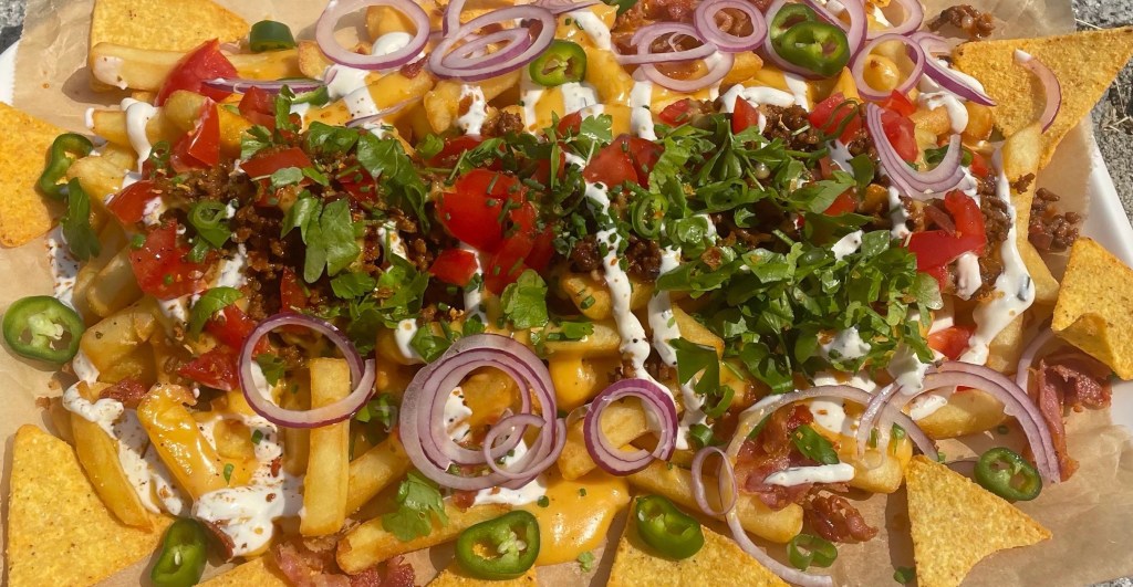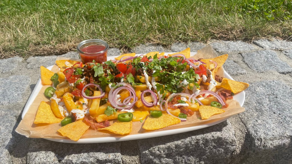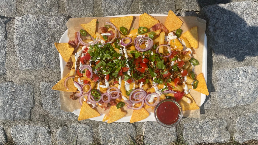 Pommes mit einer Schöpfkelle herausnehmen, in eine Schüssel geben, mit Salz würzen und anschließend auf einer Platte verteilen. Jalapeños kurz in einem Sieb abtropfen lassen. Die heiße Käse-Sauce und den Sauerrahm über die Pommes geben und mit Bacon und Jalapeños, Zwiebeln, Tomaten und den Kräutern getoppt servieren. Wer möchte kann die Platte auch zusätzlich noch mit ein paar Tacos verzieren.
