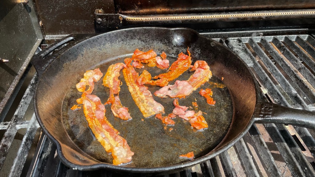 Heizt den Grill ordentlich vor und lasst den Bacon in einer geeigneten Pfanne aus, bis er knusprig ist. Lasst ihn auf etwas Küchenpapier abtropfen und stellt ihn beiseite.