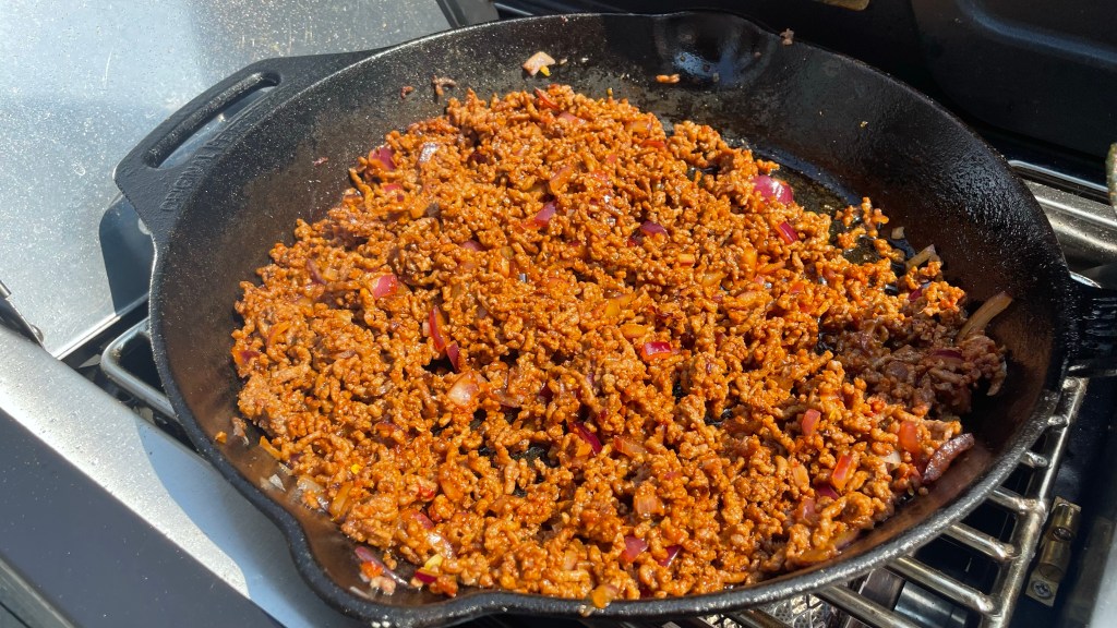 Bratet nun das Hackfleisch in dem Baconfett in der gleichen Pfanne scharf an. Gebt die gewürfelte Zwiebel und das Tomatenmark hinzu und bratet alles weiter an. Das Fleisch mit etwas Sombrero Rub und Salz abschmecken und warm halten.