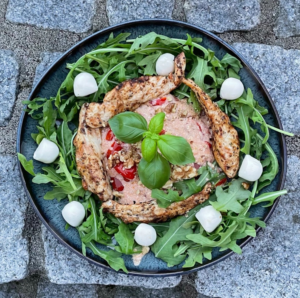 Die Brustfilets waschen, trocken tupfen und mit dem Rub würzen. Den Rucola waschen und abtropfen lassen, ebenso den Mozzarella abtropfen lassen, die Wallnusdkerne hacken und Basilikumblätter bereitstellen.