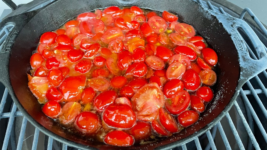 Das Olivenöl hinzugeben und das Ganze mit einem Teelöffel Zucker und einer Prise Salz würzen. Den Grill auf 130 Grad einregeln und die Tomaten unter mehrmaligem Wenden ca. 30 Minuten schmelzen lassen.