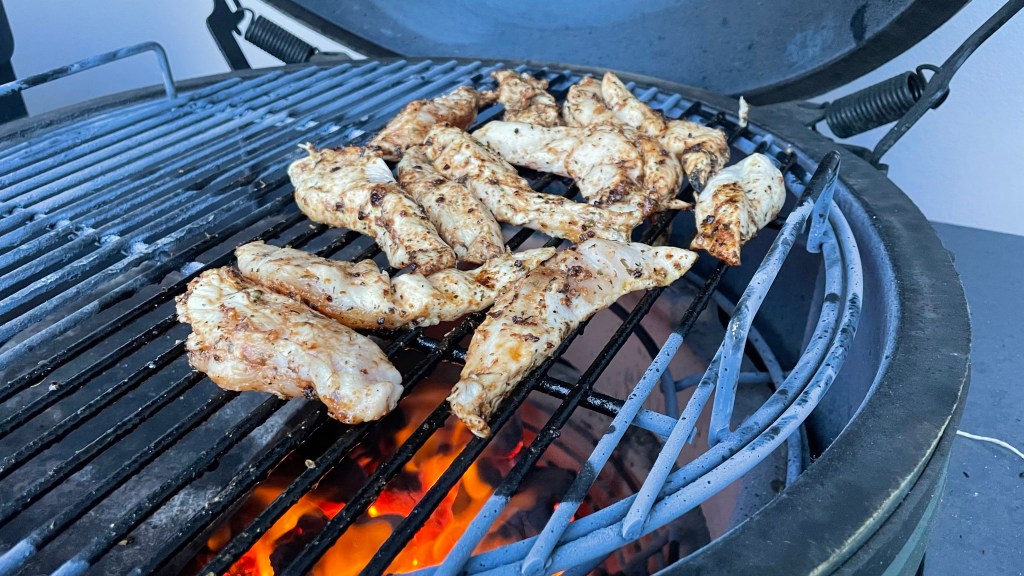 In der Zwischenzeit werden die Hähnschenbrustfiletstreifen über direkter Hitze gegrillt.