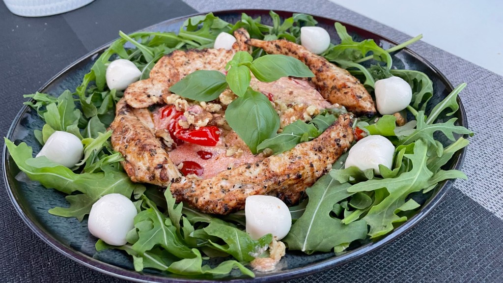 Mehr als einfach „nur“ Hähnchen mit Tomatensauce. Heute habe ich ein relativ leichtes Low Cab Rezept auf dem Big Green Egg gegrillt. Sommerlich leicht und optimal um viele reife Tomaten, nach der guten Ernte in diesem Jahr, zu verwerten. Einfach in der Zubereitung und schnell gemacht. Natürlich schmeckt dieses Gericht auch umwerfend mit frischen Spaghetti als Beilage, aber heute wollte ich den Kohlenhydraten aus dem Weg gehen und habe mich für frischen nussigen Rucola entschieden.