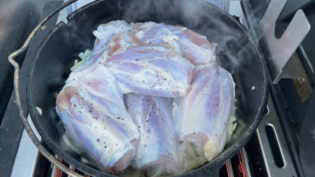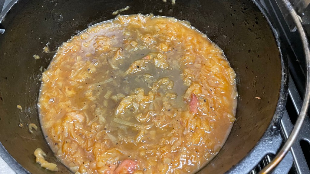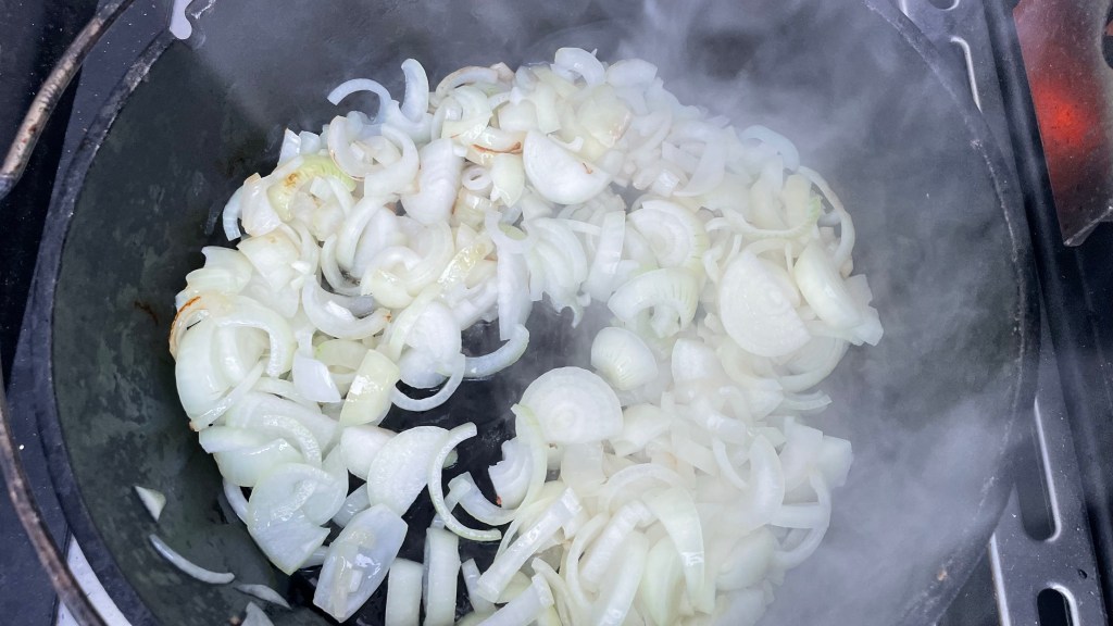 Die Gemüsezwiebeln putzen, vierteln und in Ringe schneiden. Den Grill vorheizen und in einem Dutchoven etwas Öl erhitzen. Die Zwiebeln kräftig anbraten – sie dürfen ruhig etwas Farbe bekommen.