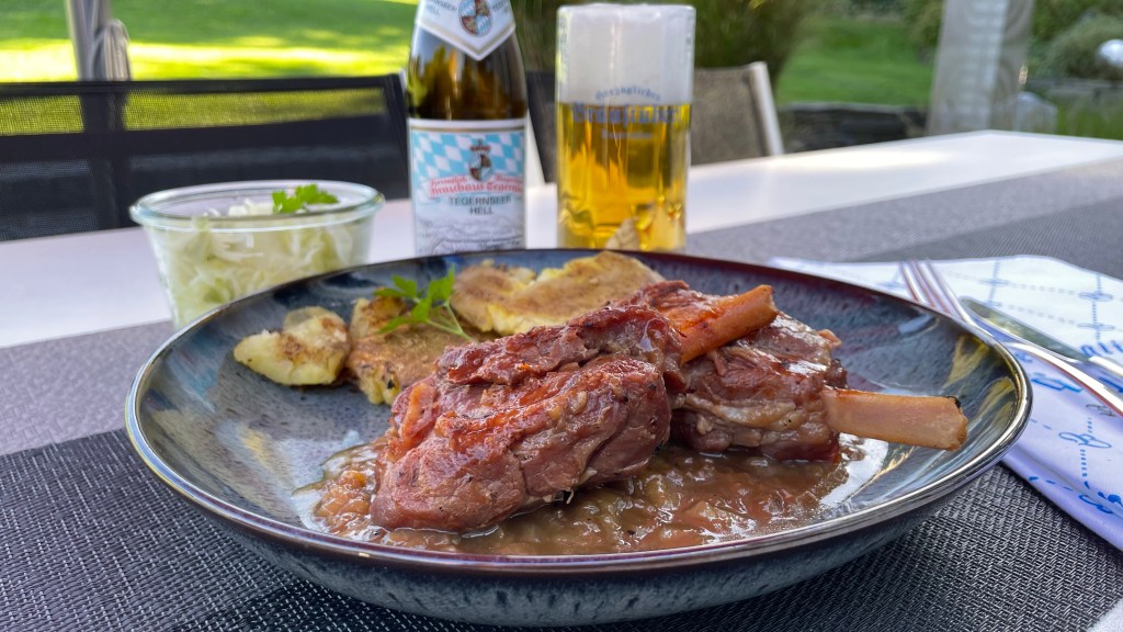 Tipp: Weil Bier den Minihaxen Saft und Aroma verleiht, bietet sich natürlich auch zum Essen ein hübsch eingeschenktes Glas an – in diesem Fall am besten ein frisches bayrisches Tegernseer Hell.