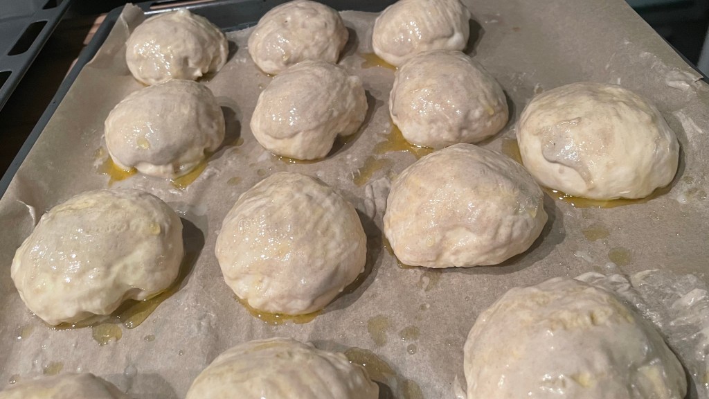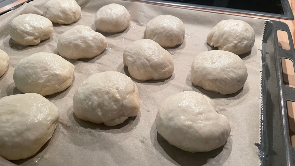 11 runde Brötchen à ca. 80g formen, auf ein Backblech setzen und direkt mit Streich 1 bestreichen, 45 Min warm ruhen lassen, dann mit Streich 2 bestreichen und abermals 20 Min ruhen lassen.