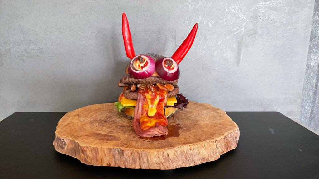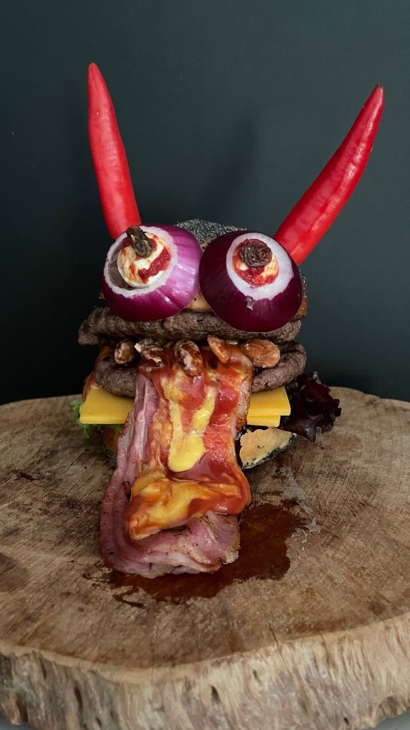Als Basis diente mir ein Burger mit 2 Patties, Salat, Cheddar und Gurke. Die Hörner sind, wie unschwer zu erkennen ist, Peperonis die ich mit Schaschlikspießen befestigt habe.
