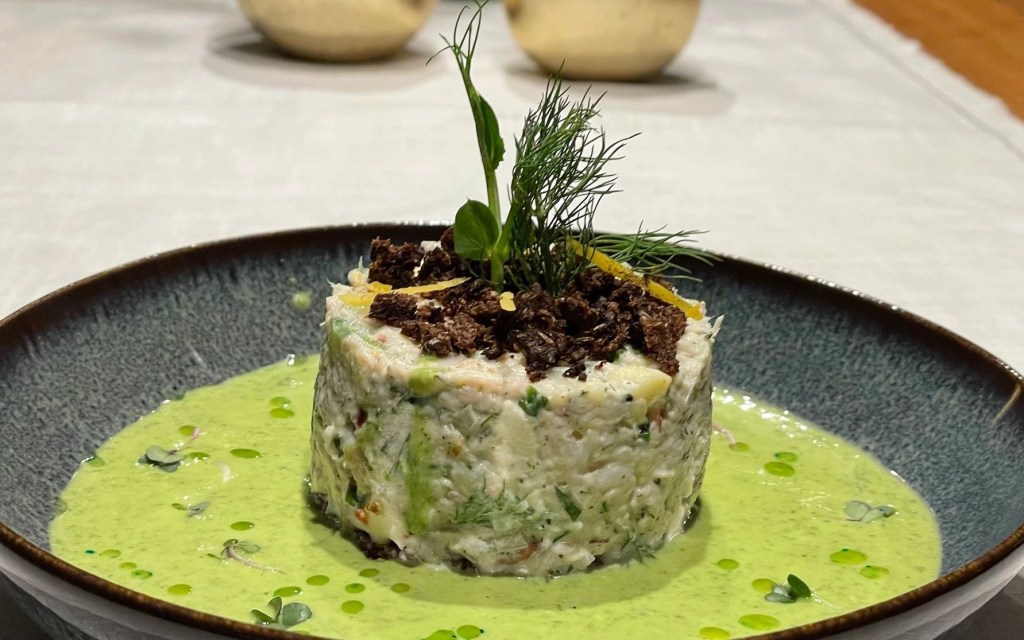 Für den Boden jeweils 2 Scheiben Pumpernickel aufeinanderlegen, die Brottaler mit je einem Metallring ausstechen und in die Ringe das Tatar füllen. Die Masse jeweils mit dem Löffel leicht andrücken, dann den Ring behutsam abziehen. Den restlichen Pumpernickel fein hacken und in einer Pfanne knusprig rösten. Mit etwas Salz abschmecken. Den Knusper auf das Tatar geben und mit ein paar Kräutern und Zitronenschalenzesten garnieren. Die Bärlauchcreme angießen und servieren.