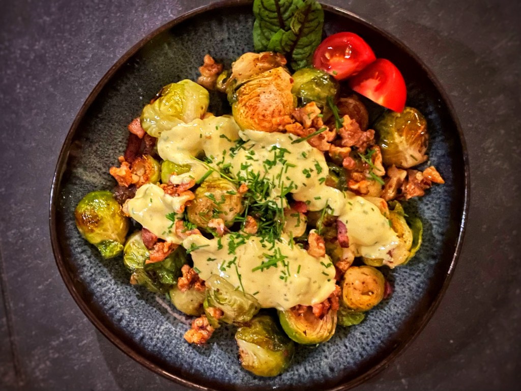 Hier ein deftiges Herbstrezept. Heute gab es crispy Rosenkohl mit Speck, karamellisierten Walnüssen und einer cremigen Senfsauce. Wer Rosenkohl mag, wird dieses Rezept lieben. Die Kombi aus dem Rosenkohl, dem knusprigen Bacon, den karamellisierten Walnüssen und der würzigen Senfsauce ist ein echter herbstlicher Gaumenschmaus…