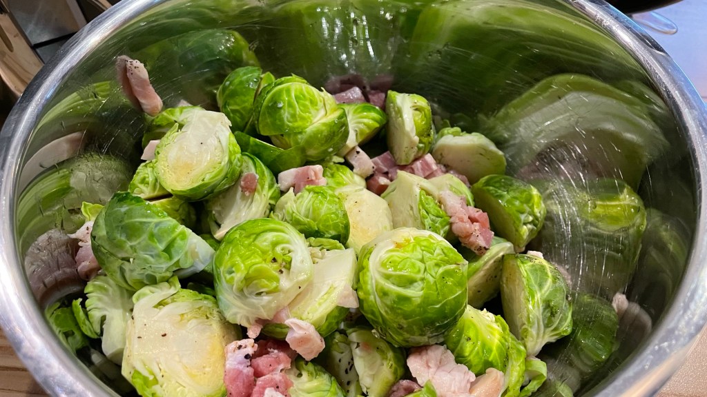 In einer großen Schüssel den Rosenkohl mit Olivenöl, Salz, Pfeffer und dem Speck vermengen.