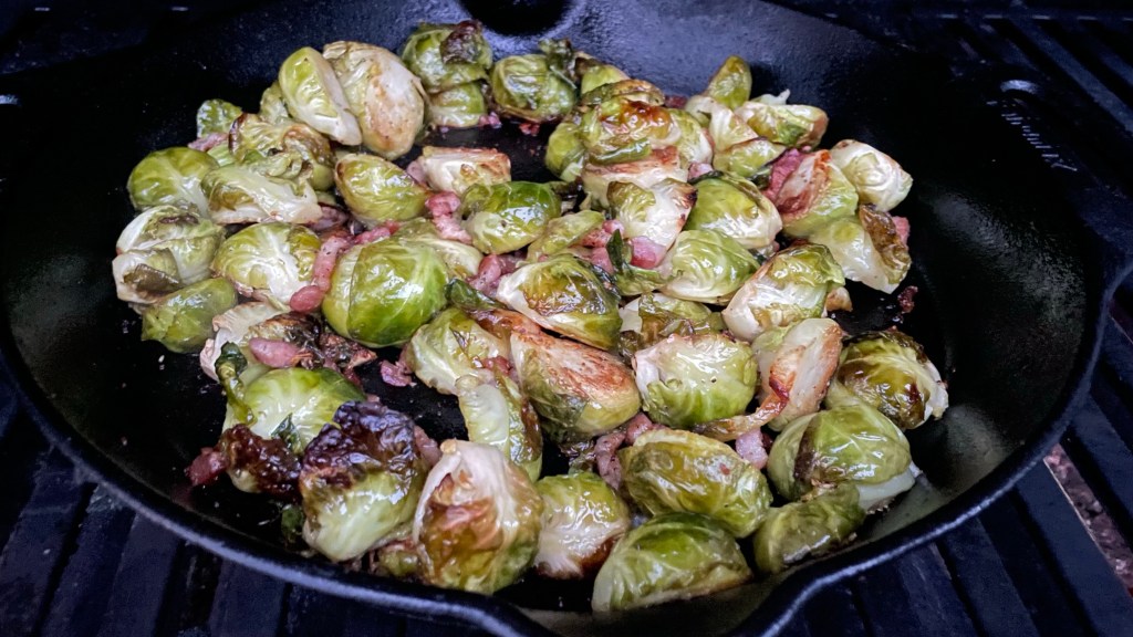 Den Rosenkohl und den Speck gleichmäßig in einer Gusspfanne verteilen und 25-30 Minuten im Grill backen, bis der Rosenkohl goldbraun und knusprig ist.
