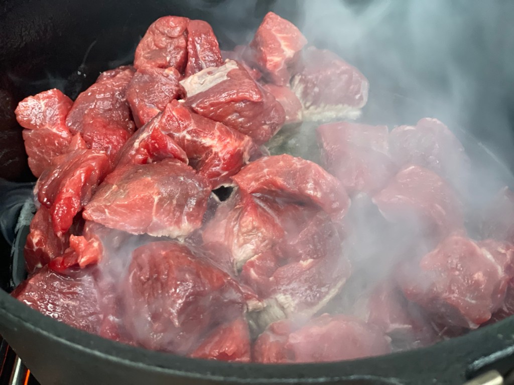 Den Dutchofen auf die Briketts stellen und gut heiß werden lassen. Den Butterschmalz in den Dutch Oven geben und Rindfleisch darin auf dem Seitenkochfeld des Grills bei starker Hitze 3–5 Minuten scharf anbraten, bis es leicht gebräunt ist.