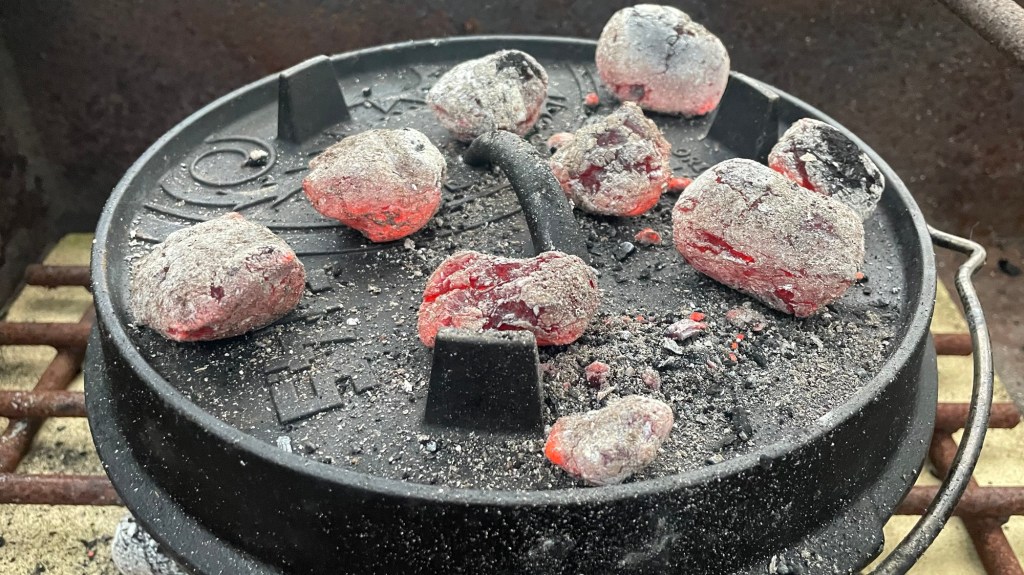 In einem Andzündkamin ca. 20 Stück Briketts vorbereiten. Später 8 Briketts auf den Deckel und restliche Briketts unter den Dutch Oven legen.