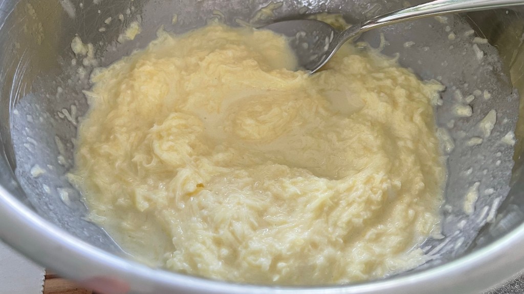 Mit einem Löffel gut verrühren. Das Mehl und das Backpulver hinzufügen, mit Salz, Pfeffer und frisch geriebener Muskatnuss würzen und erneut vermengen. Den Teig 30 Minuten durchziehen lassen.