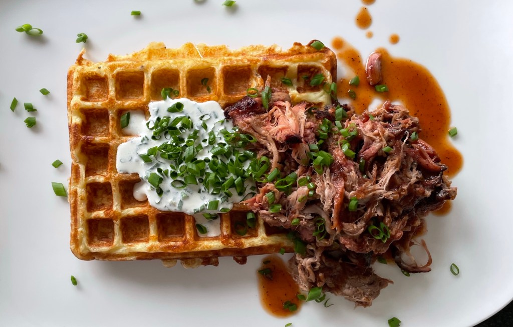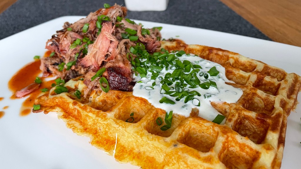 Frisches Pulled Pork aus dem Smoker ist schon eine Bank. Serviert man es auf einer deftigen Kartoffelwaffel, wird ein richtig cooles Tellergericht daraus.