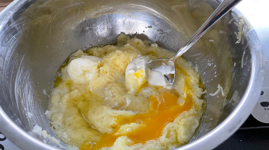 Die geriebenen Kartoffeln und Zwiebeln, den geriebenen Käse, die verquirlten Eier, die Milch, die Crème fraîche und das Öl in eine Schüssel geben.
