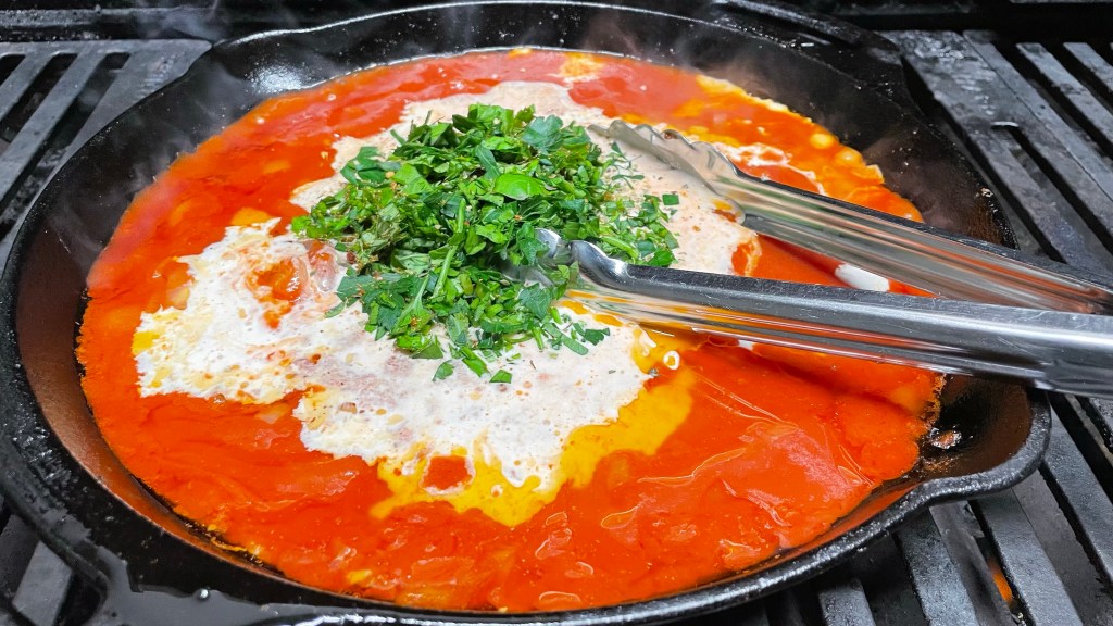 Jetzt noch ca. 20 Minuten auf dem Grill weiter schmurgeln lassen, bis die Sauce schon sämig geworden ist.