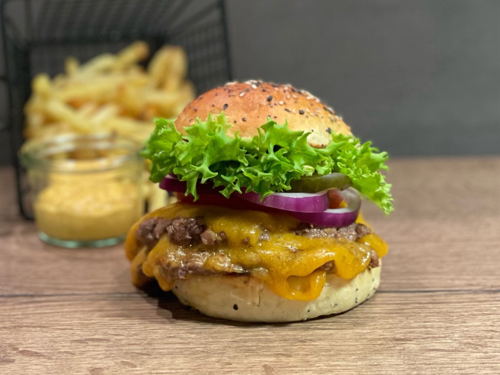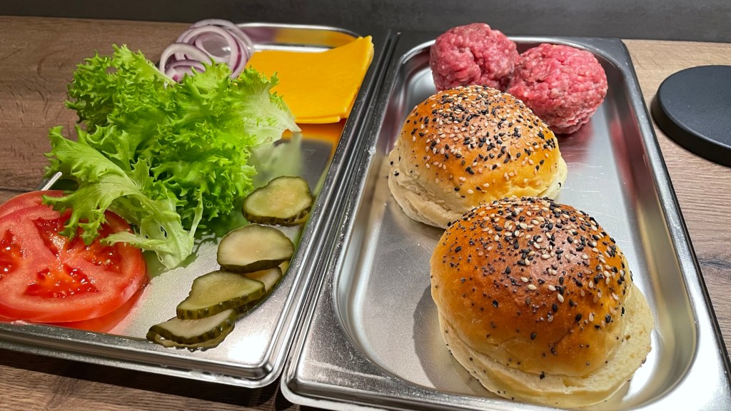 Schnell noch eine Tomate und eine Zwiebel geschnitten, ein Glas selbst eingelegte Burgergurken geöffnet, Cheddarkäse bereitgestellt und schon stand das „Mise en place“