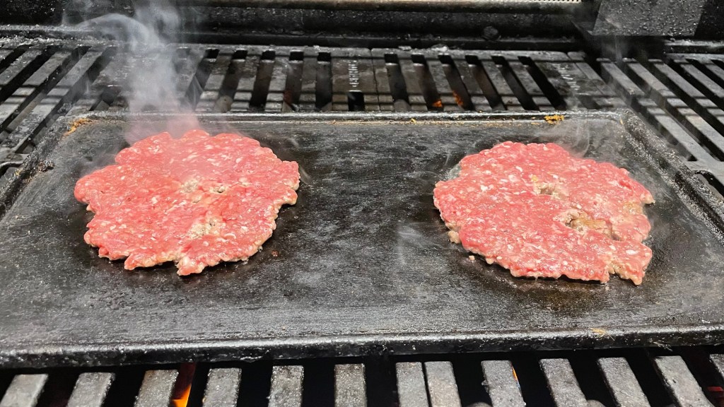 Ruckzuck wurde der Grill samt Gussplancha angeheizt und das zu Kugeln geknetete Hackfleisch auf die heiße Plancha gesmashed. Herrlich, wie das zischt und qualmt.