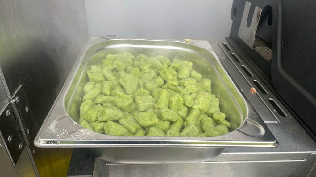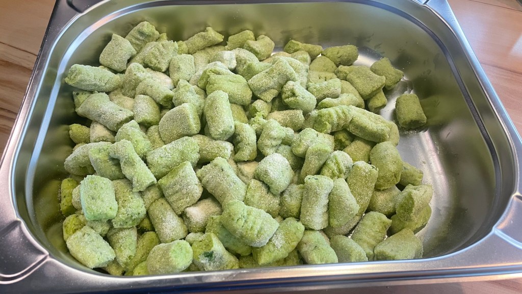 Die Gnocchi in siedendem Salzwasser garen. Sobald sie oben schwimmen sind sie gar und können rausgenommen werden. Am besten legt ihr sie auf einen geölten Teller, damit sie nicht festkleben.