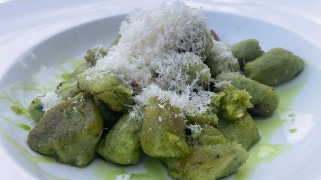 Zum Anrichten mit den gehackten Mandeln und Parmesan toppen. Etwas Bärlauchöl darüber träufeln und servieren.