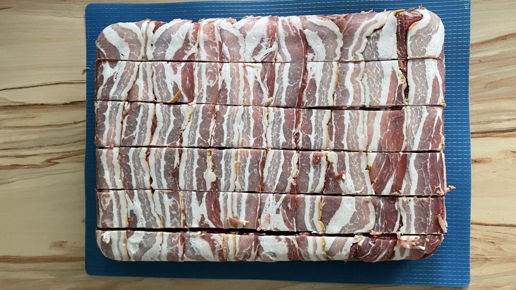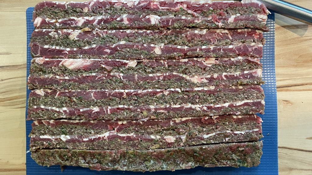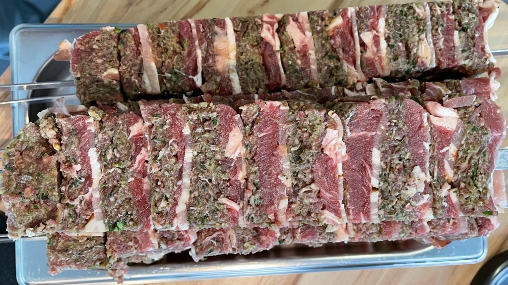 Nach 4 Stunden die Schale auf ein Brett stürzen und das „Paket“ in Streifen schneiden, diese anschließend vorsichtig hochkant drehen und stabile Spieße im passenden Abstand durchstecken.