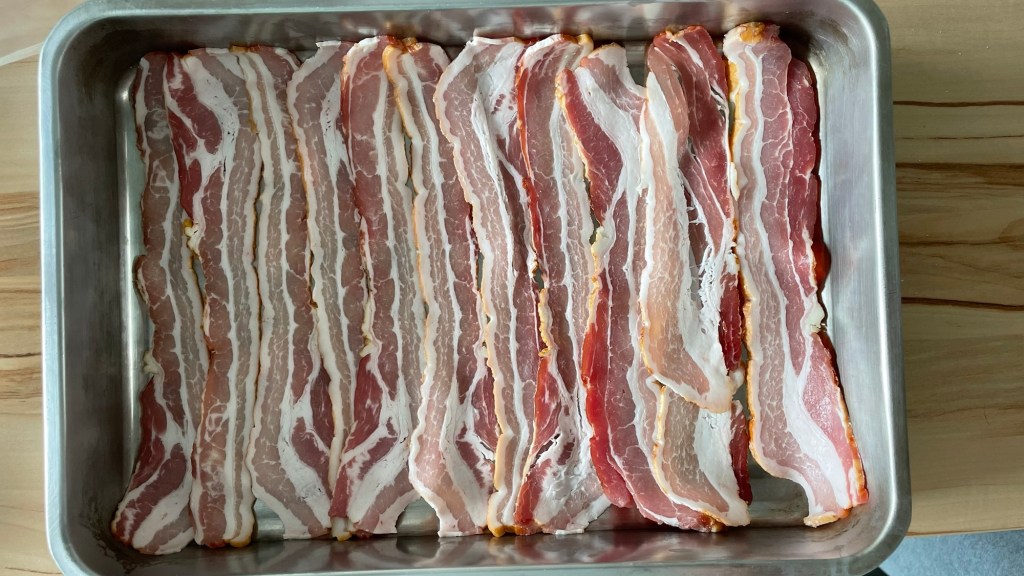 In einer passenden Form werden nun die Zutaten geschichtet. In diesem Fall habe ich die kleine Koncis Form vom Schweden verwendet. Als erstes den Boden mit Bacon auslegen