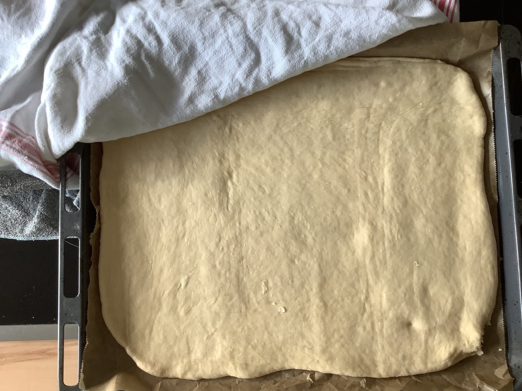 Das Ei, die weiche Butter und das Salz hinzugeben. Den Teig mit der Küchenmaschine ca. 5 Minuten kneten, bis er glatt ist. Mit einem Tuch bedeckt an einem warmen Ort ca. 30 Minuten gehen lassen. Noch einmal kurz durchkneten und auf einem mit Backpapier belegten tiefen Blech ausrollen. Erneut 20 Minuten gehen lassen.