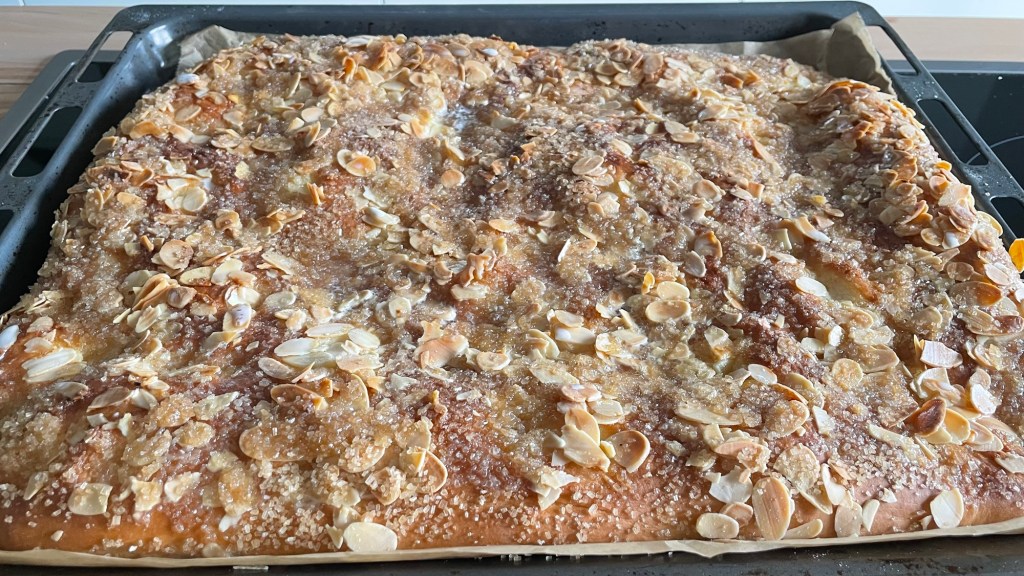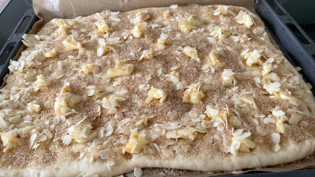 Den Backofen auf 190 Grad Ober- und Unterhitze vorheizen. Mit einem Kochlöffelstiel kleine Vertiefungen bzw. Mulden in den gegangenen Teig drücken. Butter in Flöckchen auf dem Teig verteilen. Gleichmäßig mit Zucker und Mandeln bestreuen.