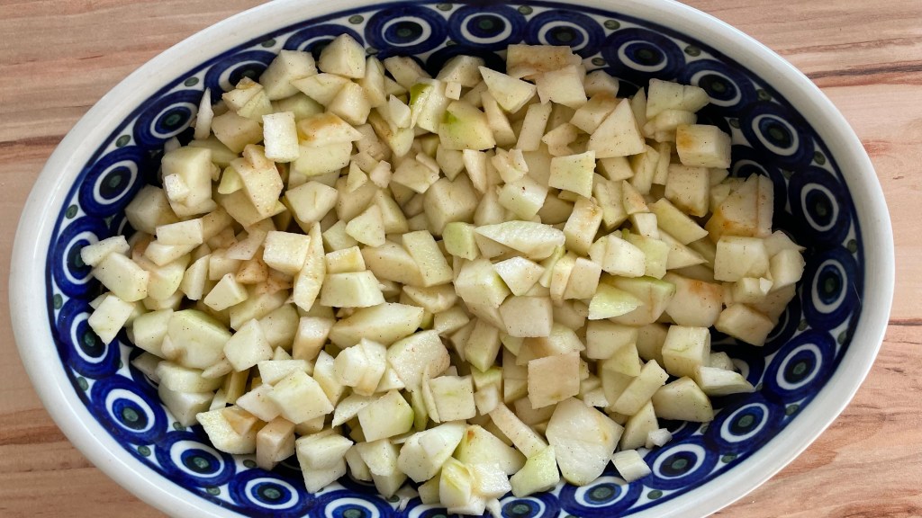Apfelwürfel in die Auflaufform geben. Üppig mit den Streuseln bedecken.
