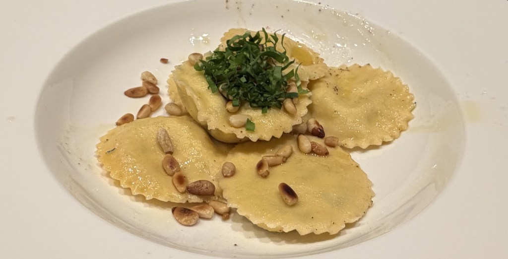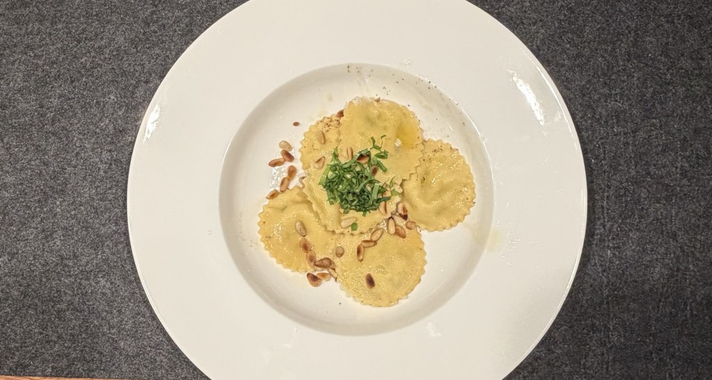 Herrlich, die zarten Ravioli mit ihrer frisch würzigen Füllung, dazu die gebräunte Butter, die zusammen mit den gerösteten Pinienkernen dem Gericht eine nussige Note verleiht.