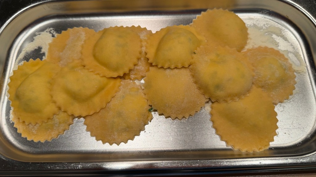 Den Teig mit der Nudelmaschine oder dem Nudelholz hauchdünn ausrollen. Kleine Kleckse der Füllung mit etwas Abstand auf eine Teigbahn setzen. Eine zweite Bahn drüberlegen, die Zwischenräume festdrücken (dabei die Luft rausdrücken!) und mit einem Teigrad oder Ausstecher in Form bringen.